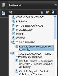 Dicho ícono se encuentra a la izquierda del documento*. Como puede ver en la imagen a continuación, Los marcadores le permitirán desplazarse rápidamente hacia los contenidos que desee ver. Puede desplegar u ocultar partes de la estructura del documento haciendo clic en el símbolo de (-) o (+) ubicado a la izquierda de los items de la lista.